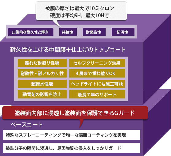 被膜の厚さは最大で10ミクロン(浸透膜1~5ミクロン+上面膜1~5ミクロン)硬度は平均9H、最大10H。私たちは、G.Guardを通じて唯一無二の素晴らしさをみなさんへ伝え、車を愛するより多くの人のもとへ届ける、それが私たちの使命です。