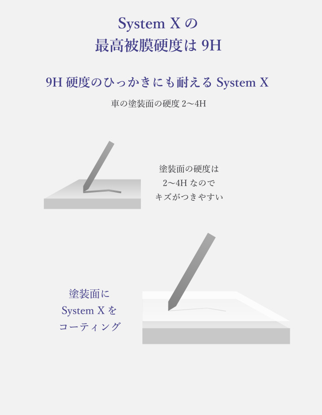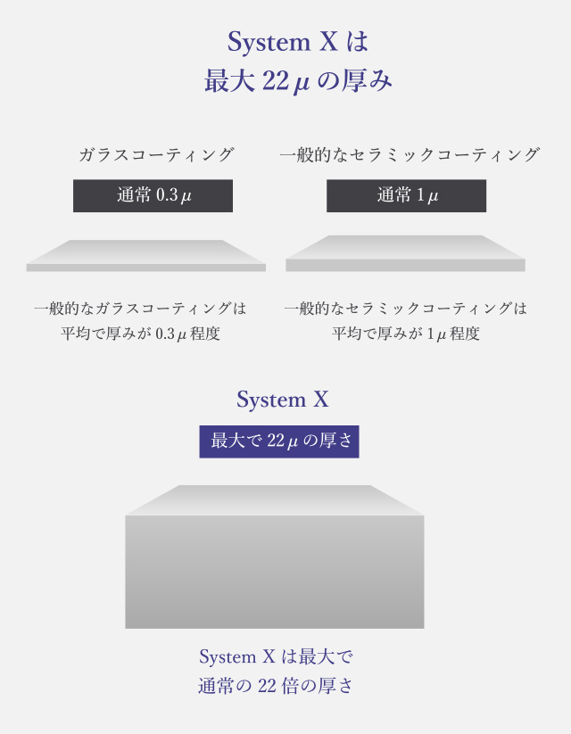 従来のセラミックコーティングは平均で厚みが1μ程度ですが、systemXは最大22μの厚みを持たせられ、最高被膜硬度は9Hと紫外線、塩水、摩擦、排ガス、極端な温度差などから愛車を保護します。