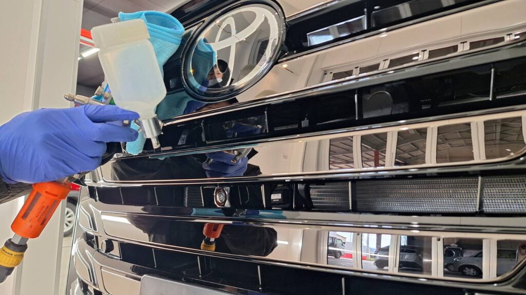 施工は、System Xの認定施工店である東洋ボデーにて、製品性能を最大限に引き出すための施工環境・設備・技術条件を満たした状態で実施しています。本施工では、単にコーティング剤を塗布するのではなく、System Xが定める施工品質の前提条件を踏まえ、仕上がりの安定性と長期的な保護性能を重視した施工を行っています。
